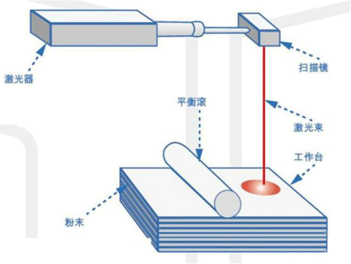 使用高功率激光束將一層金屬粉末加工熔合成型,完成熔合后,操作平臺下調(diào)一個層厚的距離,繼續(xù)加工下一層粉末,重復(fù)此步驟,直至劃定(選定的需要加工)的區(qū)域全部熔鑄完成,就得到一件立體的化合物。所需的產(chǎn)品(零件)就是這樣通逐層加工累積而成。