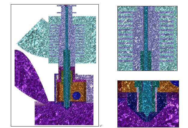 -上部散熱結(jié)構(gòu)及風(fēng)扇附近的強(qiáng)制對(duì)流(例如圖2中青色與紫色網(wǎng)格區(qū)域)??紤]到計(jì)算成本和結(jié)果精確度,此次仿真重點(diǎn)考慮這兩處流體區(qū)域?qū)囟确植嫉挠绊憽?/p>