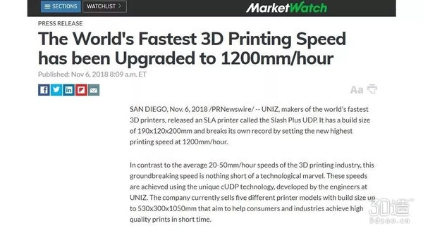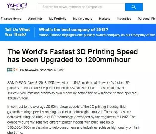 據(jù)多家外媒報(bào)道,美國東部時(shí)間2018年11月6日,早上 8:09 ,全球最快3D打印速度再次被UNIZ科技改寫!UNIZ科技的桌面級(jí)3D打印機(jī)在cUDP(連續(xù)單向剝離)超高速模式下,實(shí)現(xiàn)了1200mm/Hour驚人打印速度。而同行業(yè)的其他3D打印機(jī)平均打印速度在20-50mm/hour。